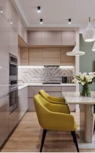 - Pastikan jarak antara dua kabinet cukup lega untuk memudahkan aktivitas memasak.