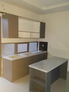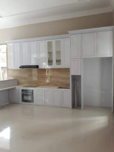 - Biasanya terdiri dari kabinet bawah dan atas yang dipasang pada salah satu sisi dinding dapur.